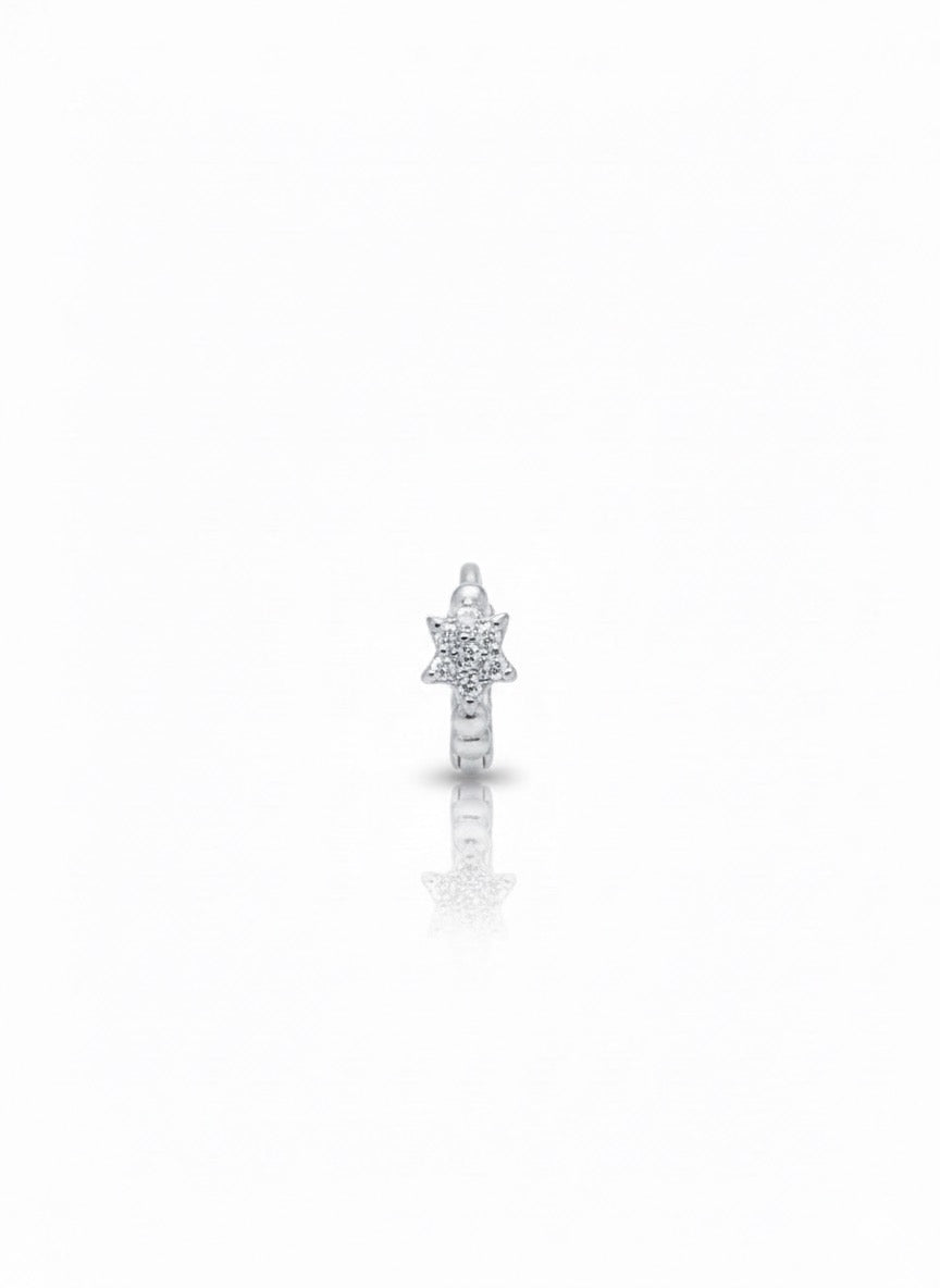 Un diseño delicado y luminoso. Este aro pequeño de 9 mm destaca por su motivo central en forma de flor con circonitas engastadas que aportan un brillo sutil y elegante. Ideal para llevar en el primer o segundo agujero, combina fácilmente con otros pendientes de la colección.