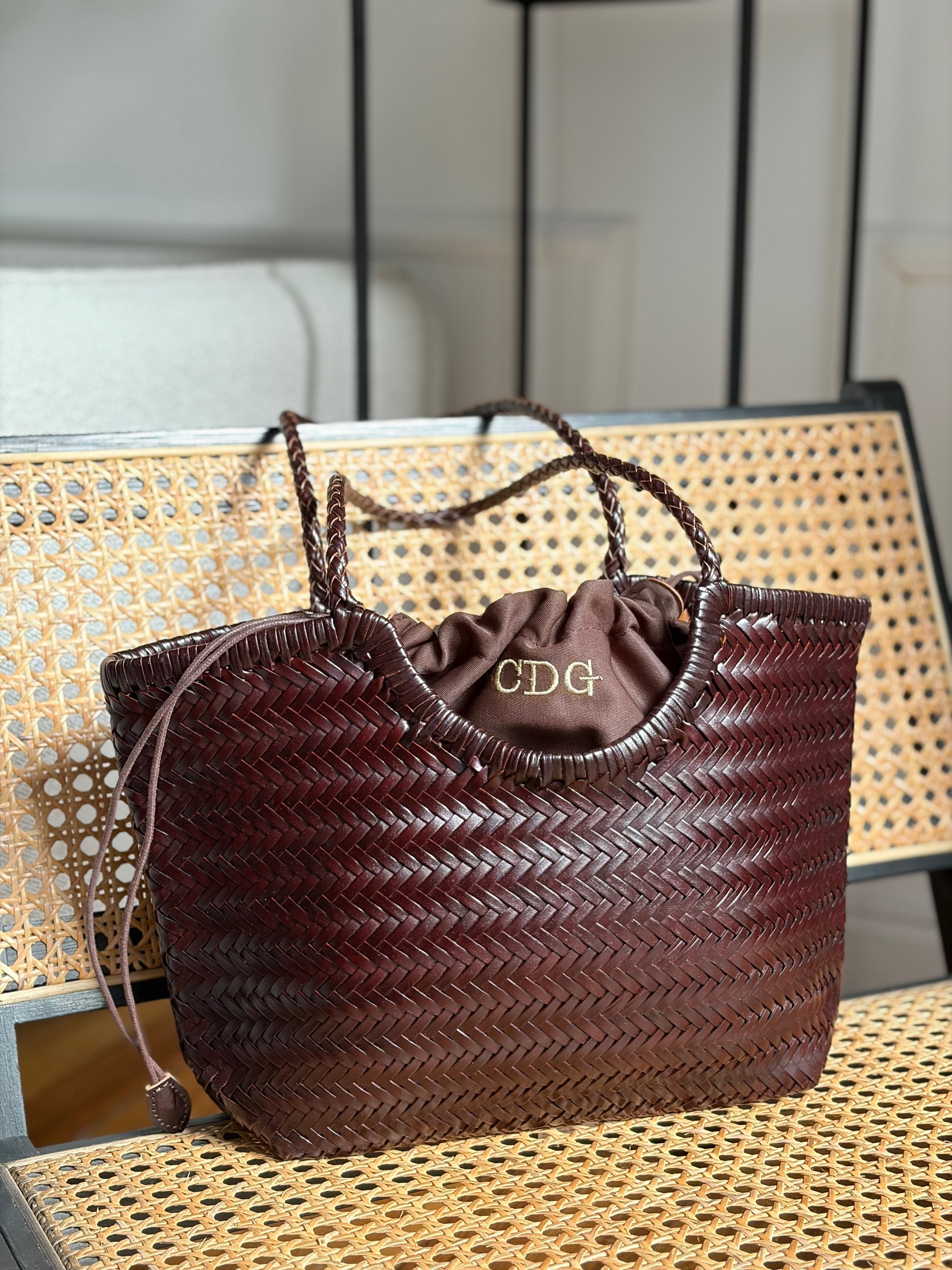 Las asas, también trabajadas a mano, ofrecen un agarre cómodo y resistente para el uso diario. Como detalle especial, permite personalizar la saca interior con iniciales bordadas, convirtiéndolo en una pieza única y exclusiva.