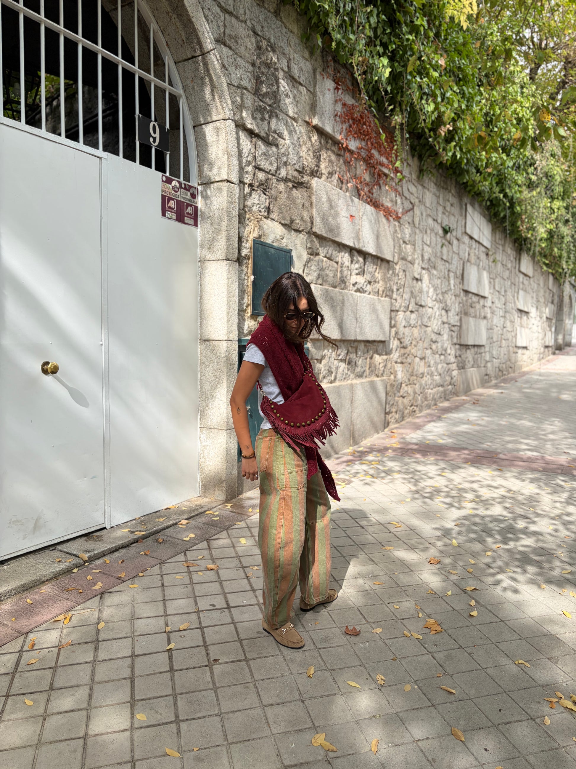 Los flecos laterales y las tachuelas metálicas aportan movimiento y carácter al diseño.