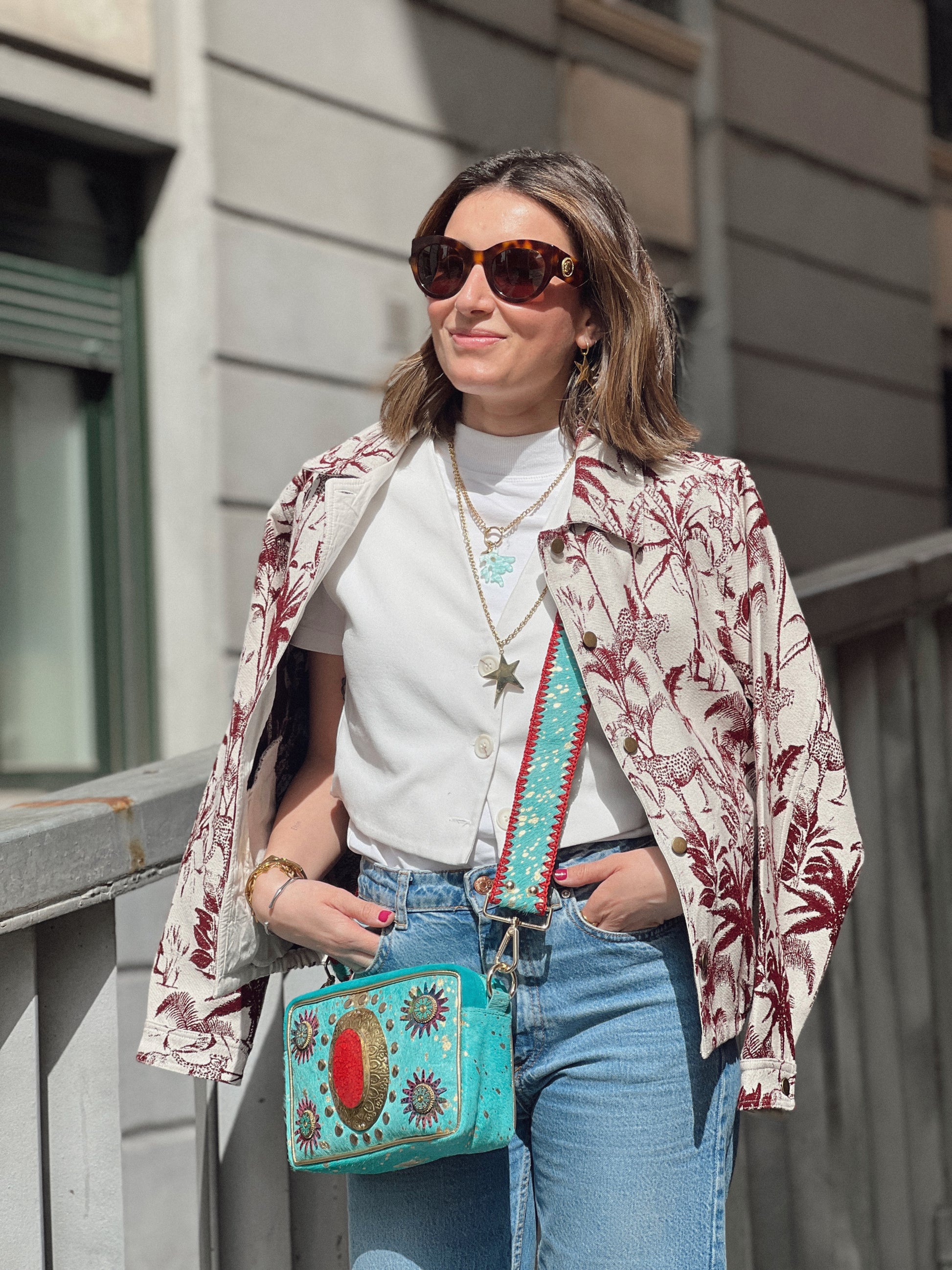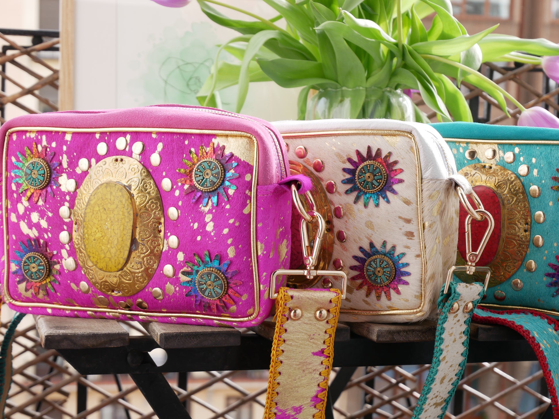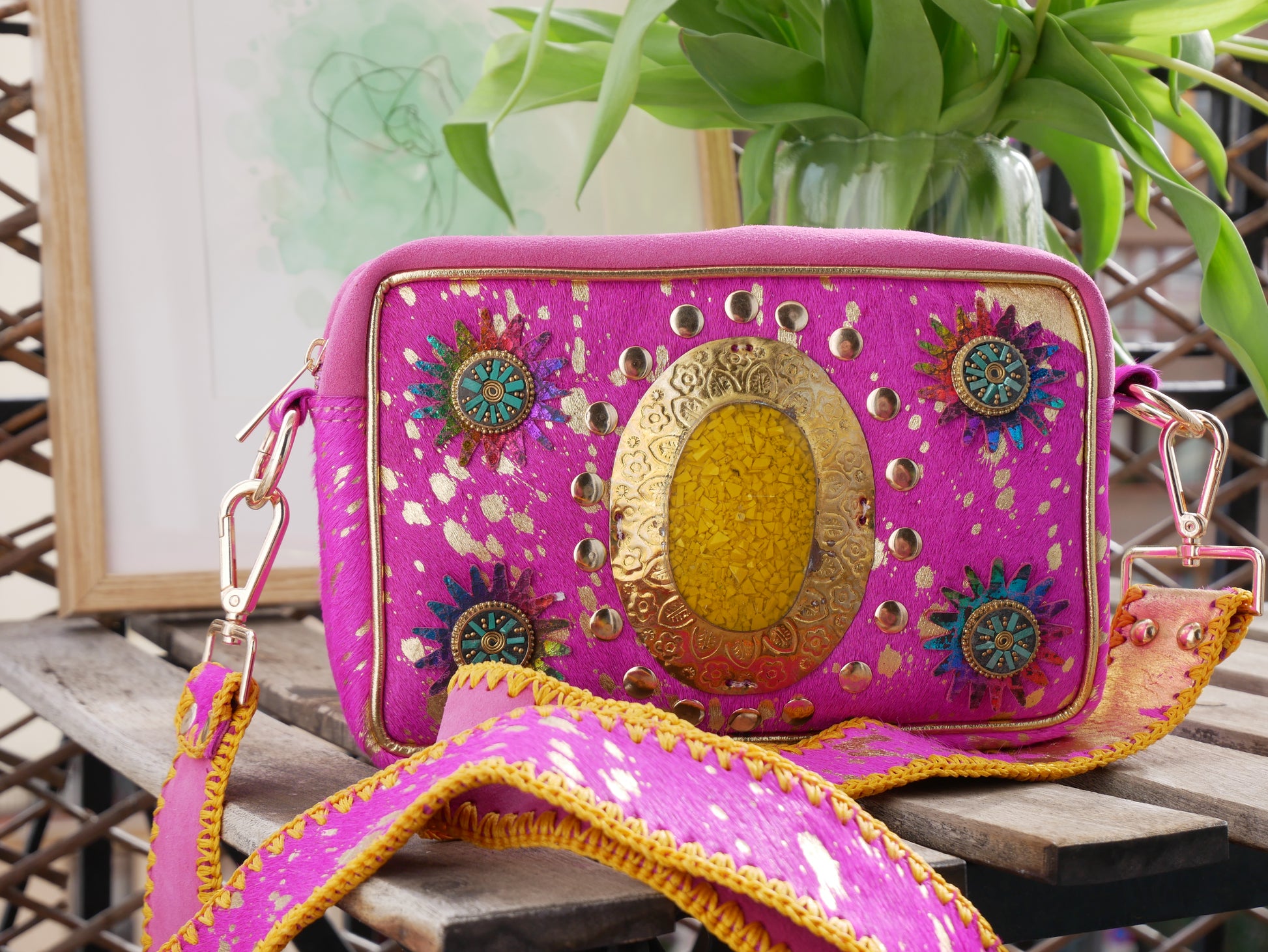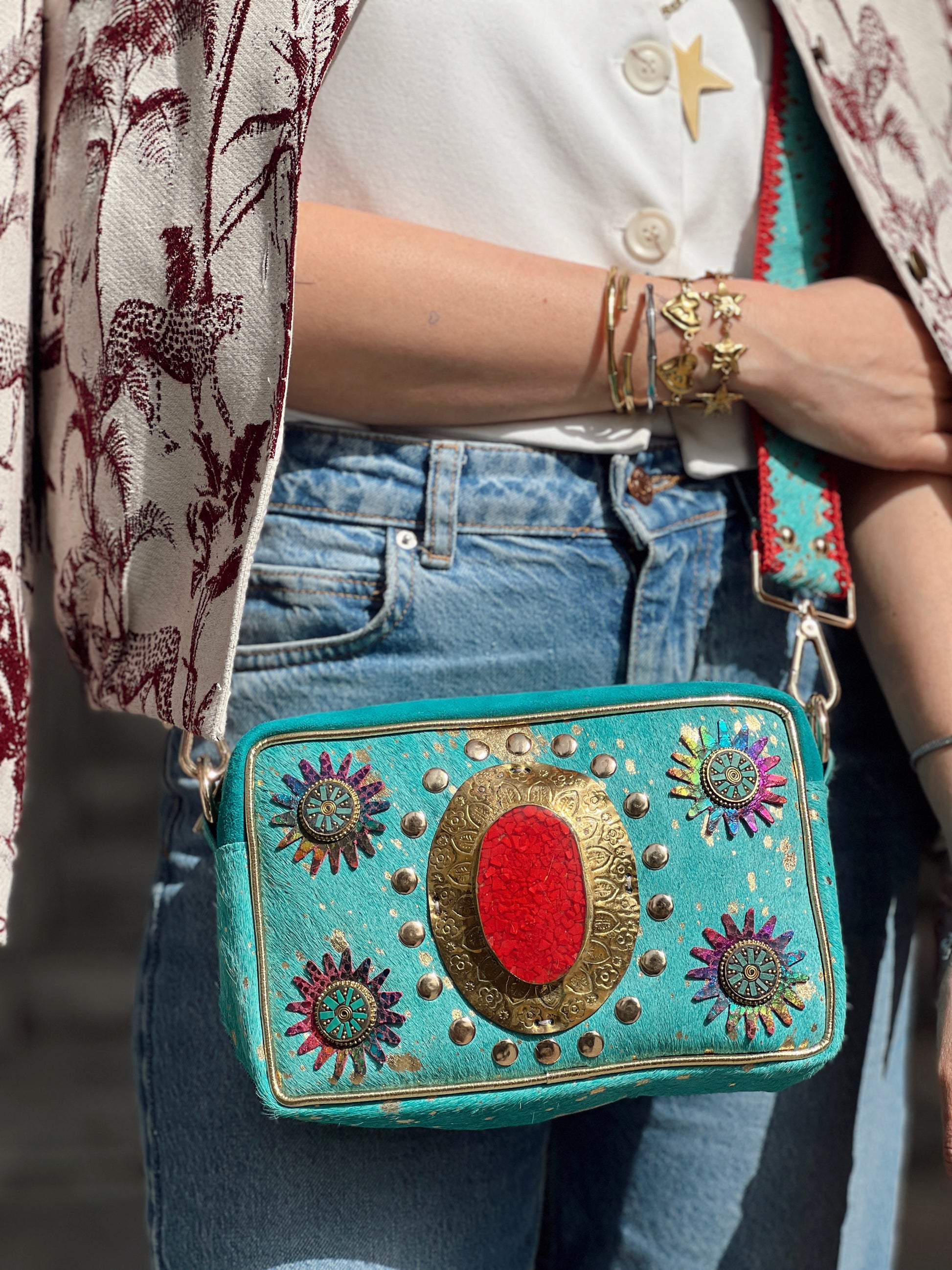 Diseñado y fabricado de forma totalmente artesanal con cuero genuino, gemas y chapas.