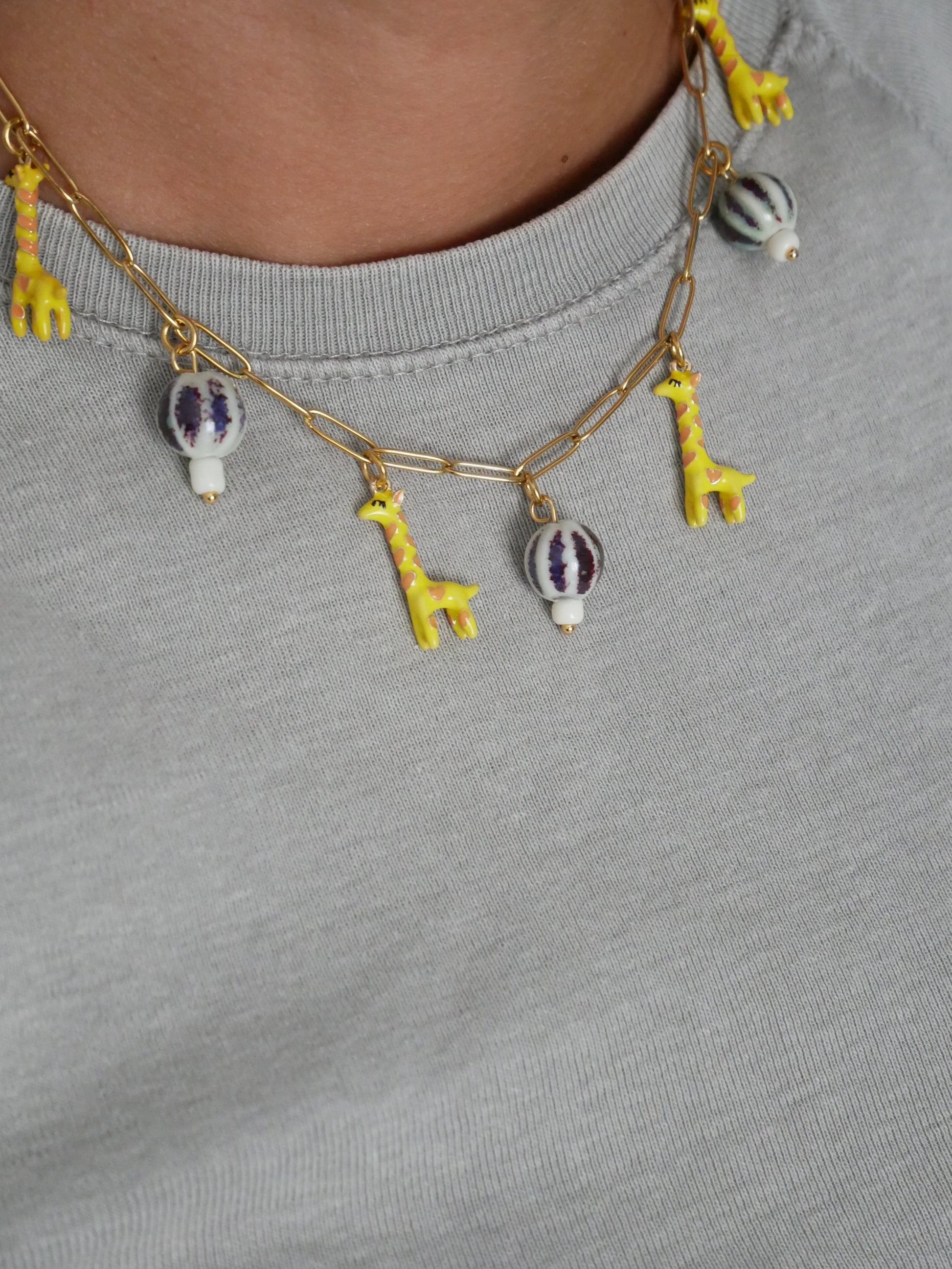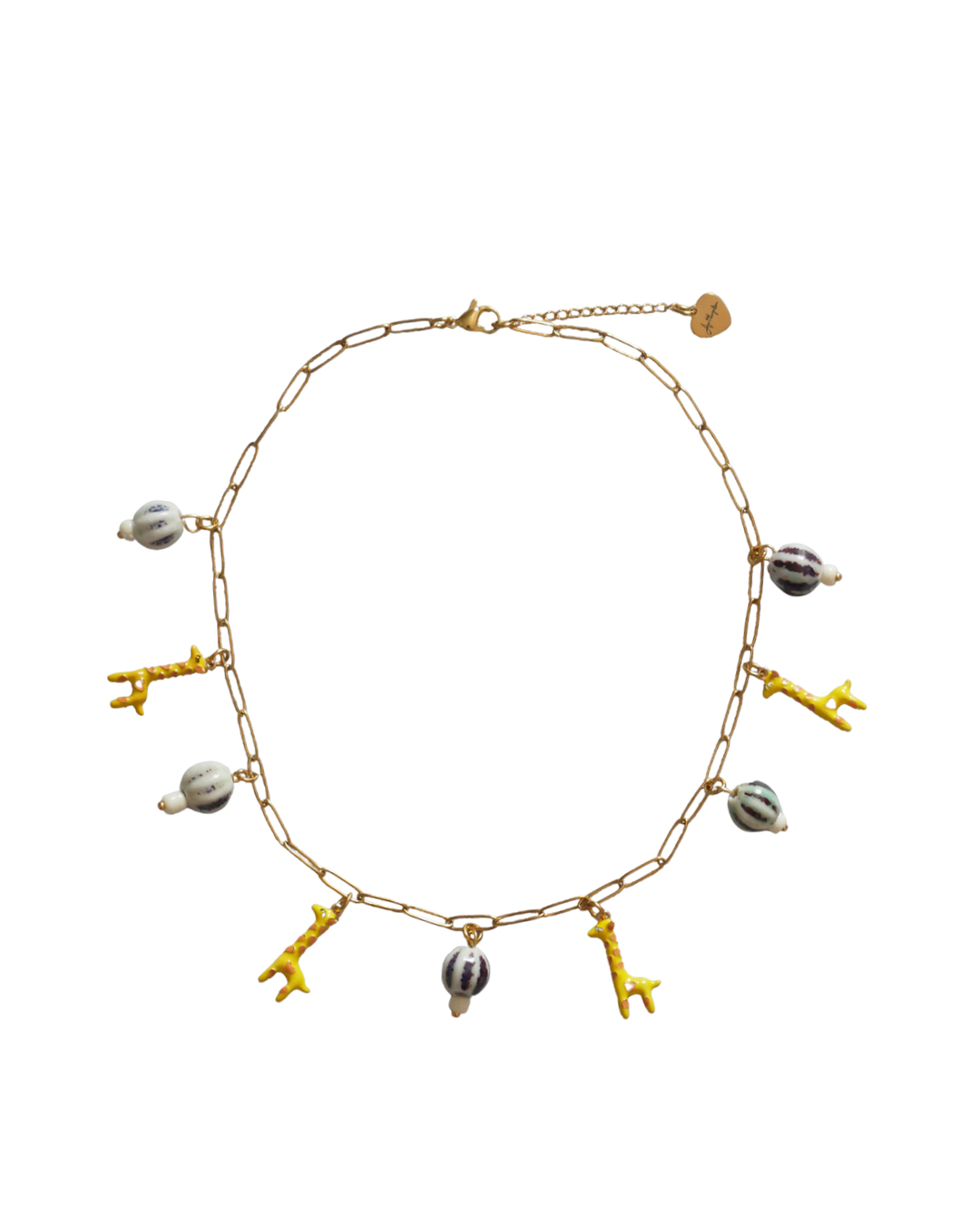 El Colgante Jirafas es una joya divertida y diferente que combina originalidad con un aire sofisticado. Diseñado con acero inoxidable, cuentas de cerámica y miyuki blanco, destaca por sus pequeños charms en forma de jirafa esmaltada que lo convierten en una pieza única.