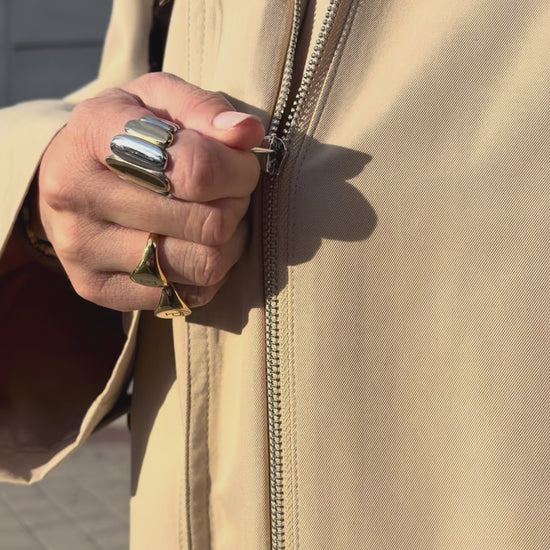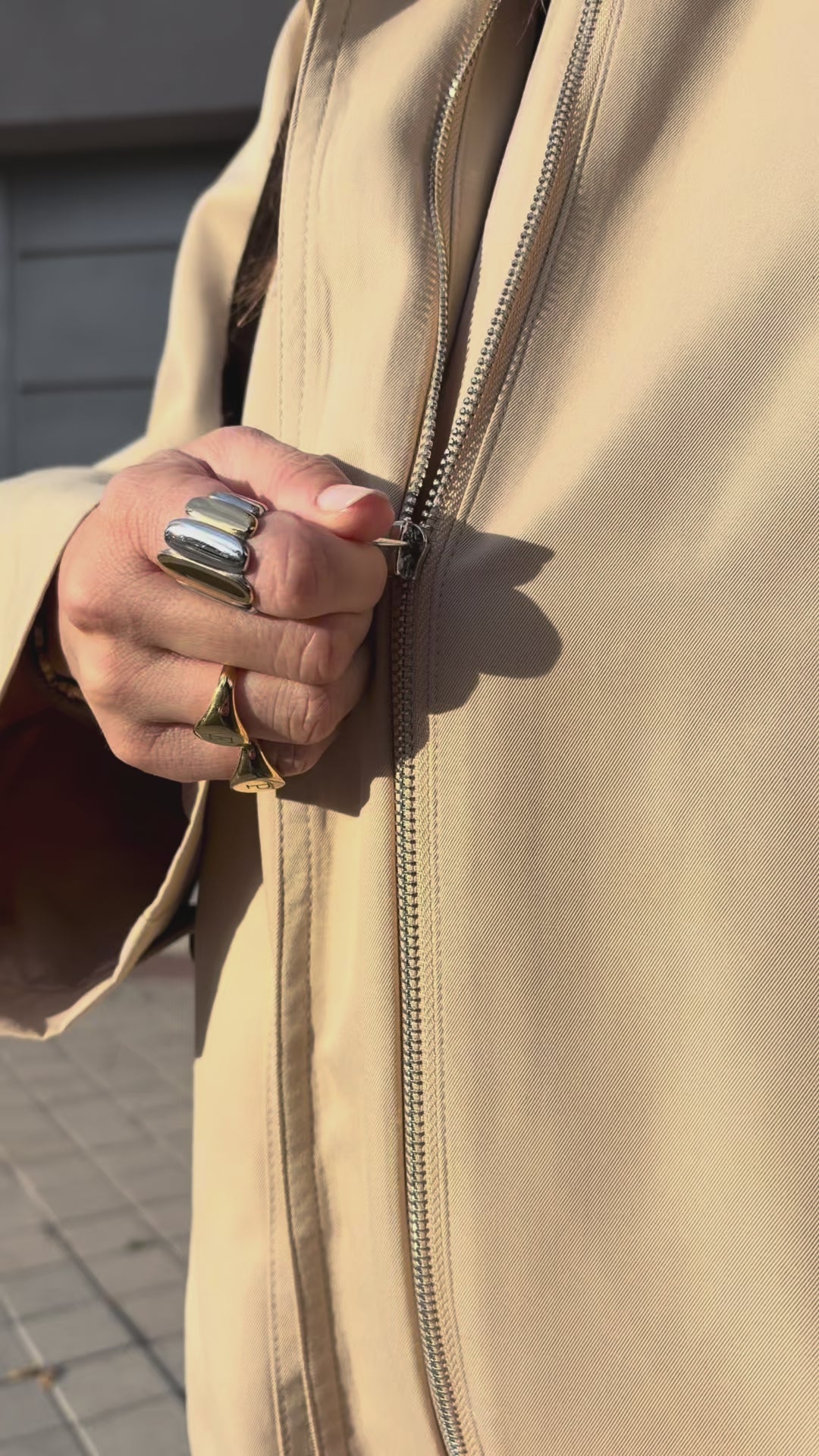 Chaqueta de corte tipo capa con acabado mini-trench. Incorpora cuello de polipiel trenzada, cierre de cremallera con botón superior y bordado Ayutthaya&me en la manga. Diseño amplio y estructurado, adecuado para distintos tipos de cuerpo.