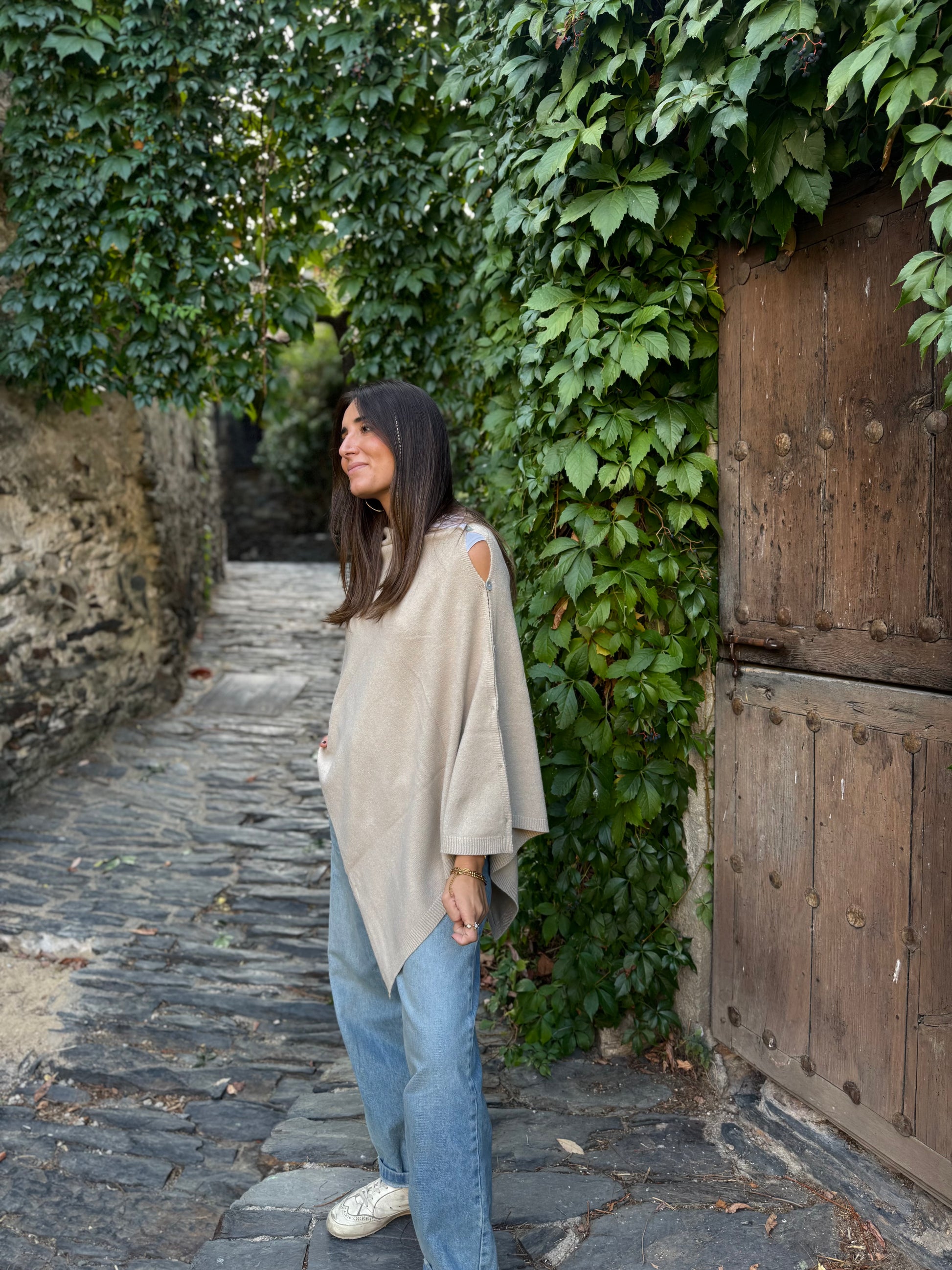 El poncho de punto beige es la mezcla perfecta entre comodidad y elegancia. Su tono claro aporta luminosidad y combina con todo, convirtiéndolo en un básico atemporal para tu armario.