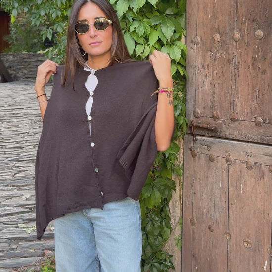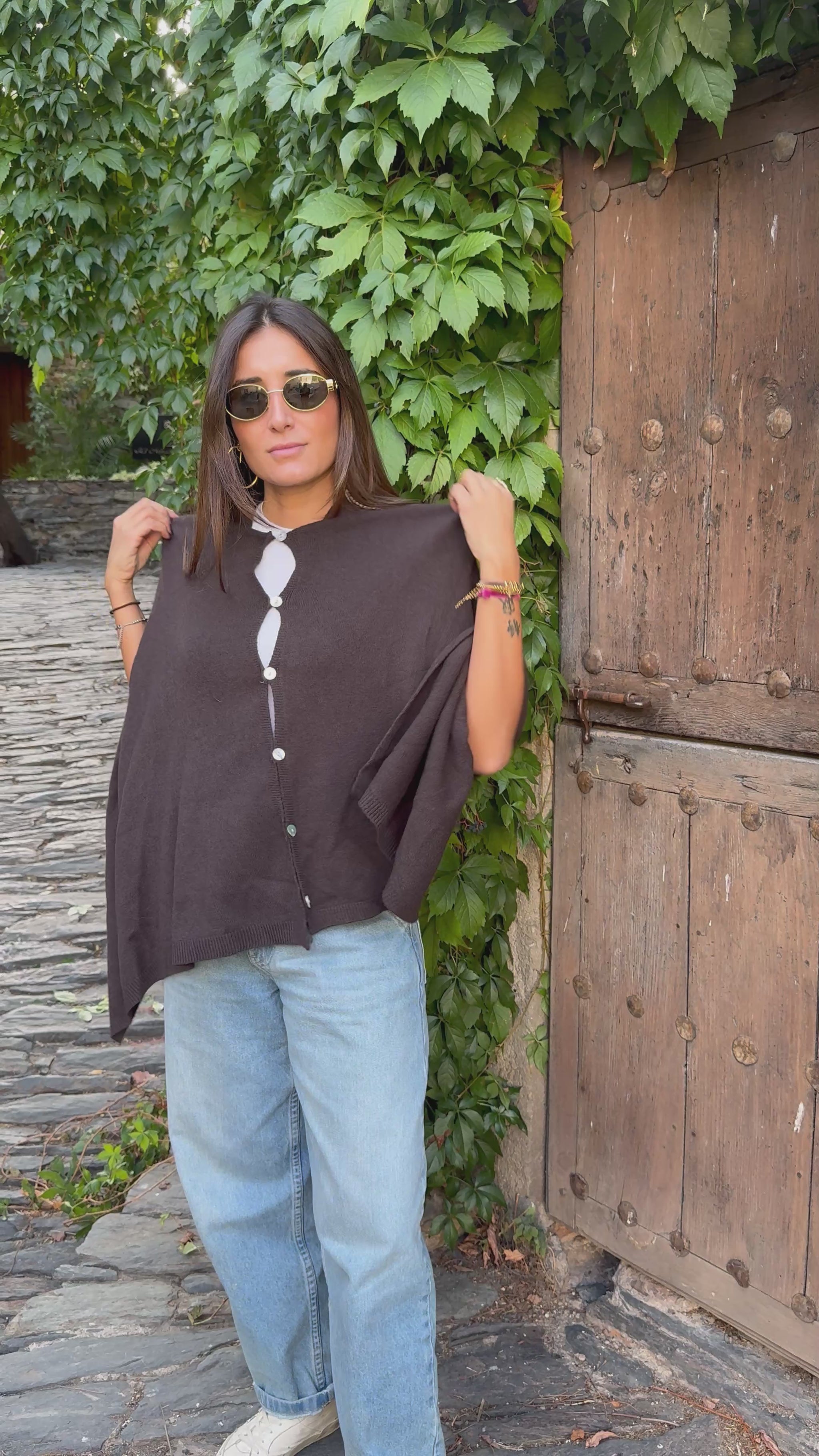 Su diseño con botones permite llevarlo de varias formas: cerrado al frente para un look clásico, abierto sobre los hombros para un aire relajado o en el brazo con efecto capa para un toque más sofisticado. Una prenda ligera, cálida y versátil que se adapta a cualquier ocasión.