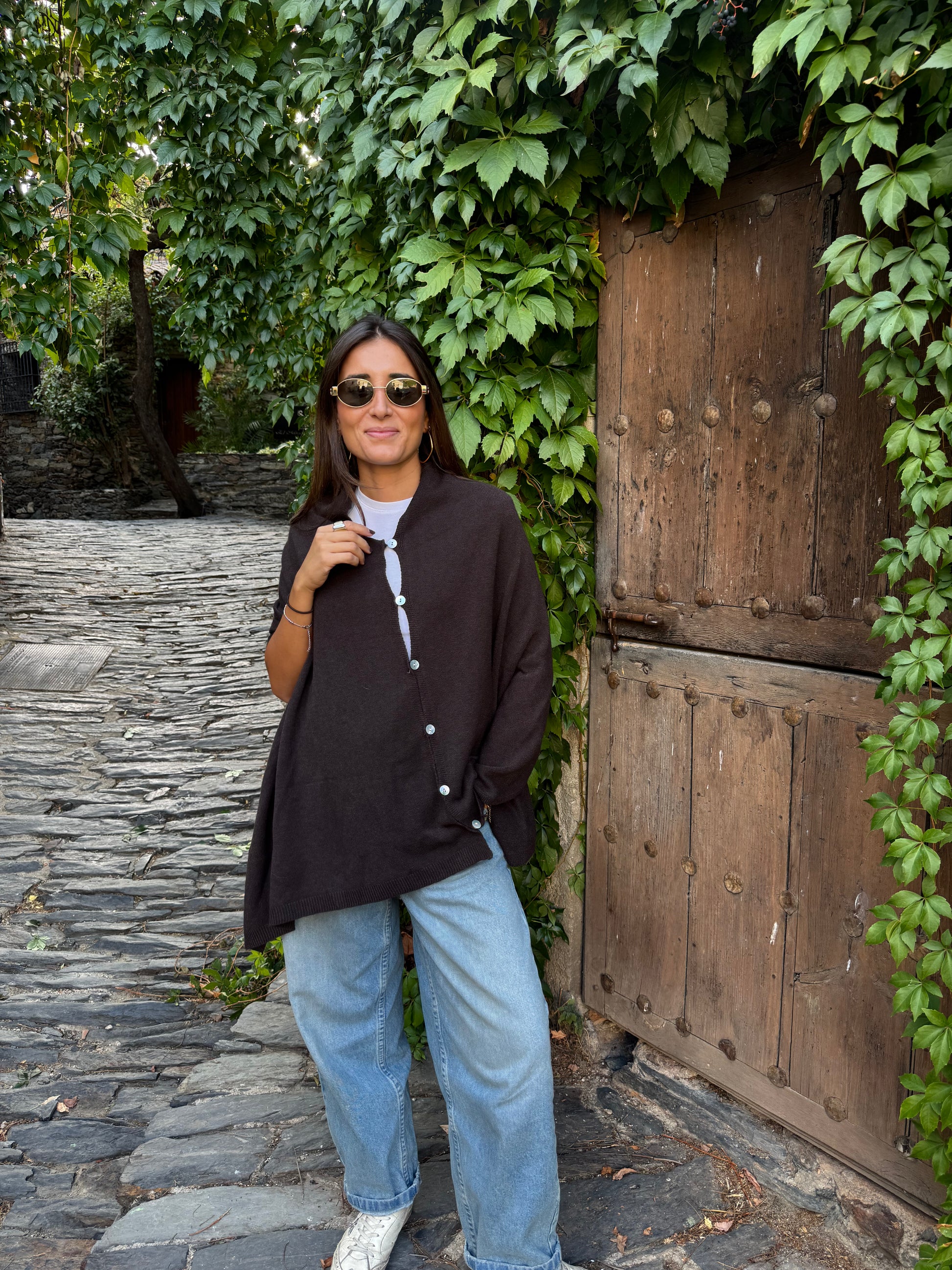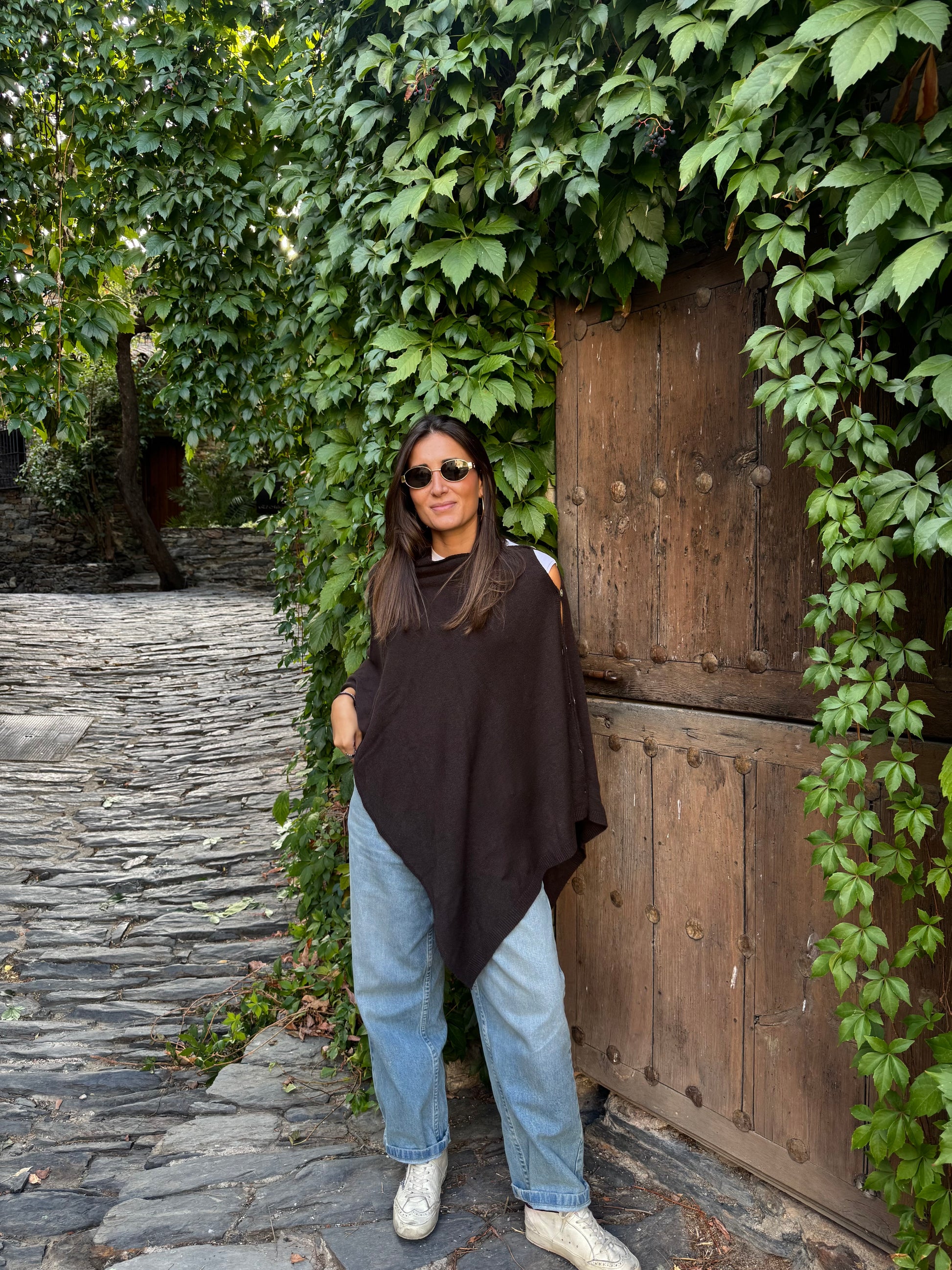 El poncho de punto marrón es esa prenda versátil que se adapta a cualquier estilo. Su diseño con botones permite llevarlo de diferentes maneras: cerrado al frente como un clásico, abierto para un aire más relajado, o incluso en el brazo con efecto capa épica.